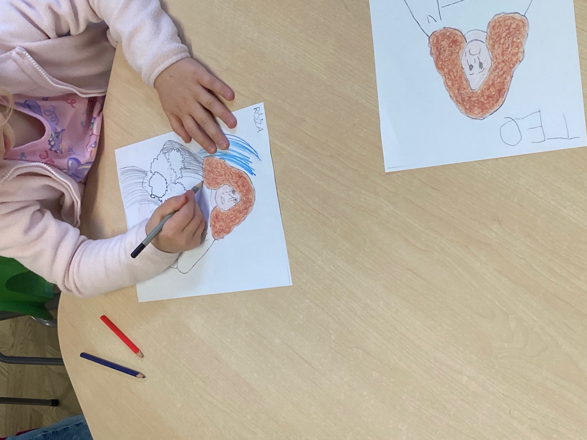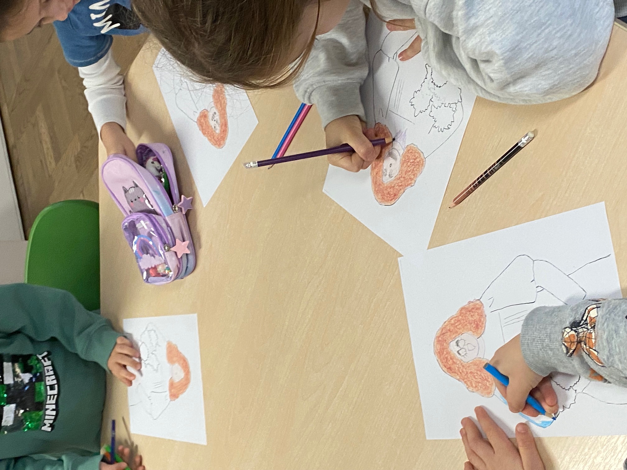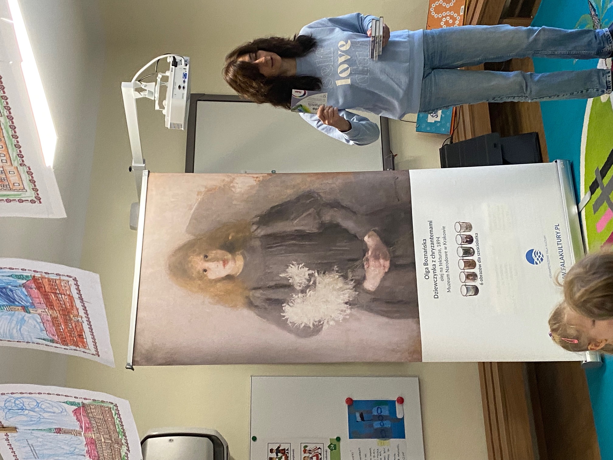 Podczas kolejnych warsztatów dzieci poznały obraz Olgi Boznańskiej „Dziewczynka z chryzantemami”, zwracając uwagę na jego tematykę i nastrój. Następnie wykonały własne prace plastyczne inspirowane dziełem, używając materiałów plastycznych.