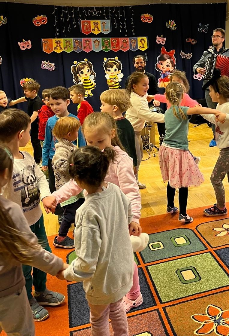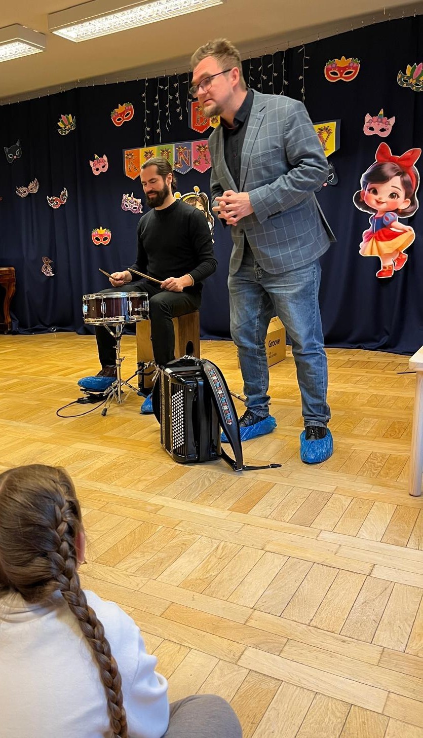 Podczas zajęć dzieci poznały elementy zestawu perkusyjnego oraz dowiedziały się, co wpływa na brzmienie poszczególnych instrumentów. Nie zabrakło ich aktywnego udziału – wspólnego odkrywania rytmu i tańców karnawałowych z różnych stron świata.
