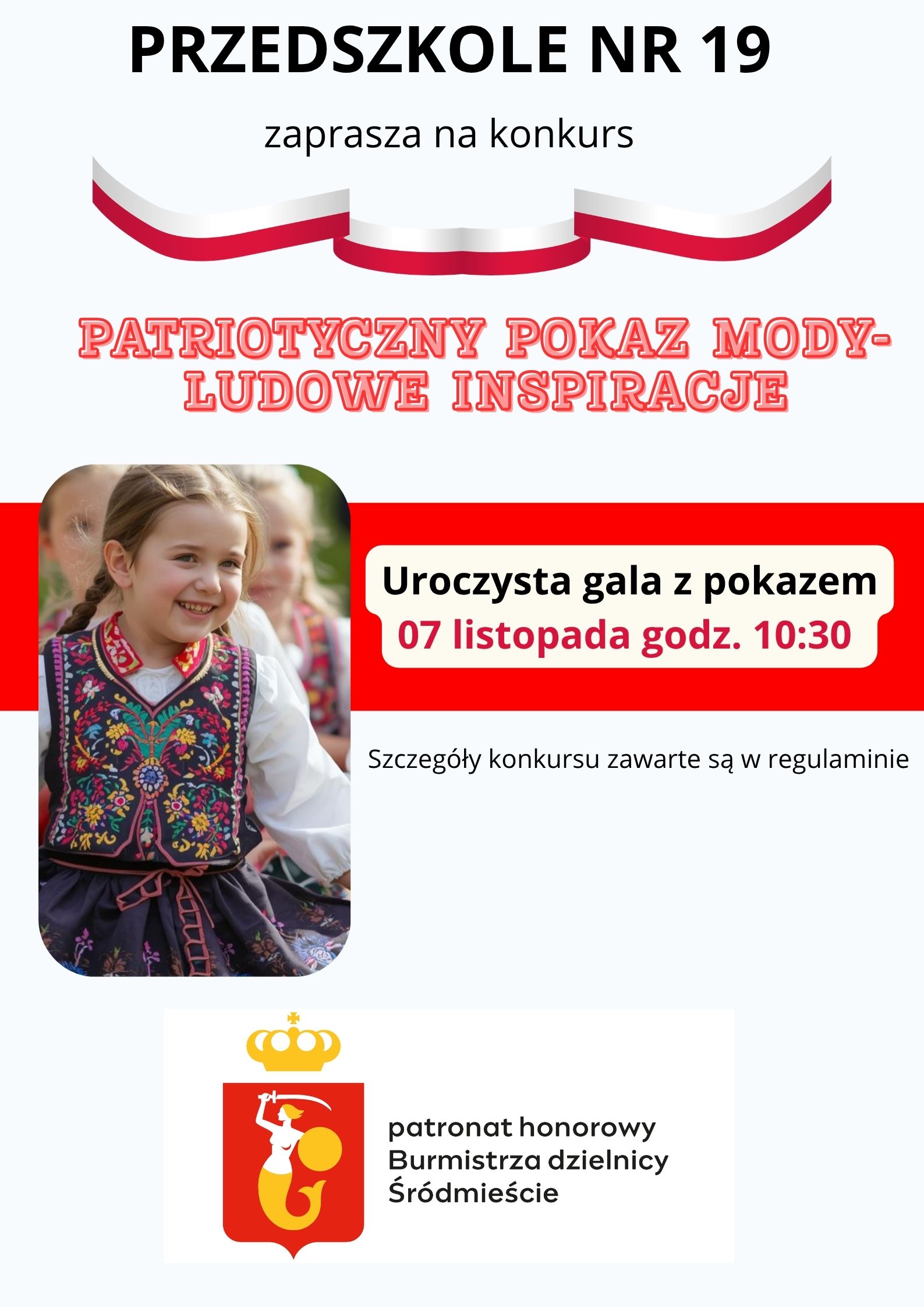 Z radością informujemy, że po raz drugi zapraszamy wszystkie przedszkola z dzielnicy Śródmieście do udziału w konkursie fotograficznym „Patriotyczny pokaz mody – LUDOWE INSPIRACJE”, który odbywa się pod honorowym patronatem Burmistrza Dzielnicy Śródmieście. Celem konkursu jest rozwijanie postaw patriotycznych wśród najmłodszych oraz zachęcanie dzieci do poznawania bogactwa polskiej kultury ludowej – barwnych strojów, tradycji i wzorów, które od pokoleń są częścią naszego dziedzictwa. Szczegółowe informacje znajdują się w regulaminie.